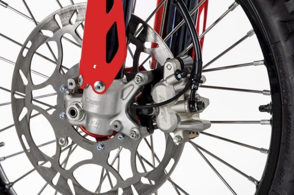 Vorderradbremse: Formula-System mit radial montiertem 4-Kolben-Bremssattel, komplett mit Bremsleitung nach Luftfahrtstandard und speziellem Hauptbremszylinder, mit Ergal-Adapter, made in Italy
