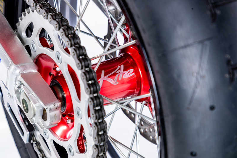 • Kite-Hinterrad mit gefräster Aluminiumnabe, rot eloxiert, und schwarz eloxierter Excel-Felge